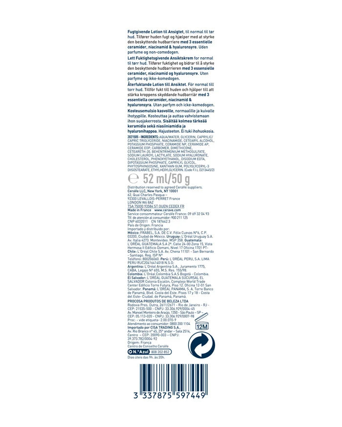 La Loción Hidratante de Rostro de CeraVe hidrata la piel, al mismo tiempo que mantiene y restaura la barrera protectora. Está formulada con Niacinamida, para calmar la piel; Ácido Hialurónico, para retener la humedad; y 3 ceramidas esenciales. Tiene una textura ligera y no es comedogénica. Contiene la Tecnología patentada MVE para mantener la hidratación por 24 horas. Sin perfume, ni aceites.