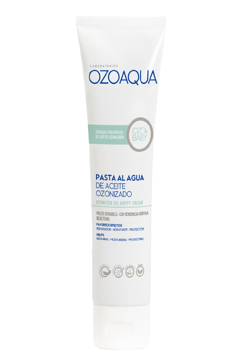 La Pasta al agua de Aceite Ozonizado OzoBaby está especialmente formulada para la protección, cuidado y prevención de irritaciones y complicaciones en la zona del pañal, proporcionando una sensación de alivio y confort inmediato. Su fórmula innovadora a base de Aceites Vegetales Ozonizados combinados con Óxido de Zinc, α‑Bisabolol, Pantenol, Manteca de Karité, Vitamina E, Almidón de Arroz y Cera de Carnauba, favorece una acción reparadora, hidratante y antioxidante. Su aplicación crea una barrera de protección que ayuda a restaurar la función barrera y a recuperar el estado fisiológico natural de la delicada piel del bebé, aislándola de factores irritantes como la orina y las heces.
